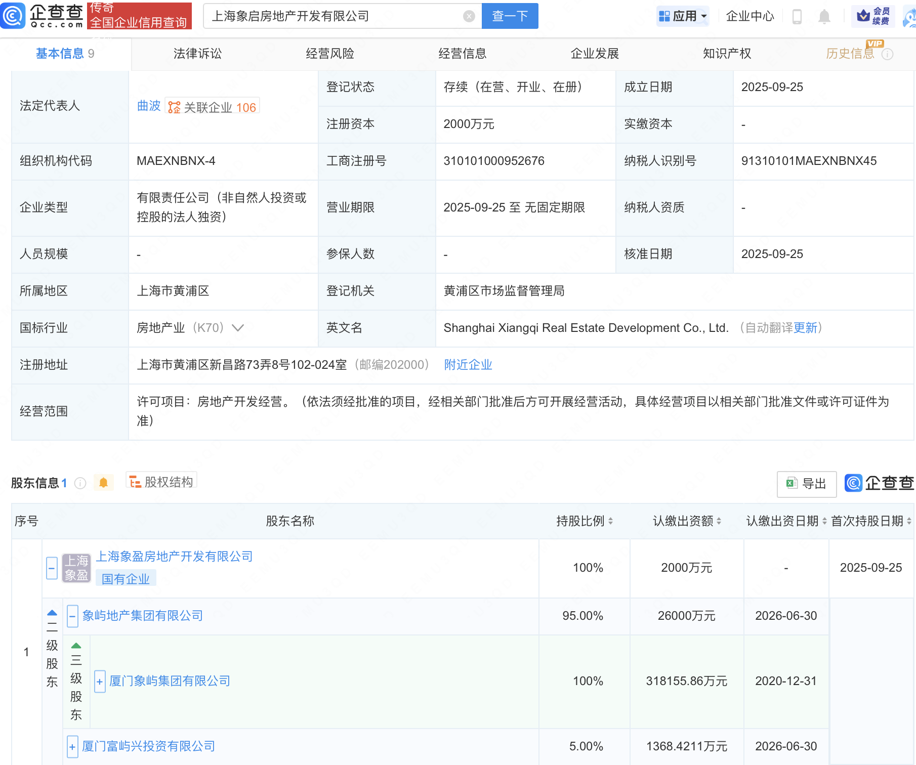 近日,上海象启房地产开发有限公司成立,注册资本2000万元,经营范围包含:房地产开发经营。企查查股权穿透显示,该公司由厦门象屿集团有限公司旗下上海象盈房地产开发有限公司全资持股。