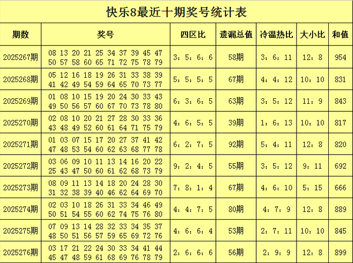 福彩快乐8第2025276期开奖回顾:03 17 21 22 24 30 33 34 41 44 45 47 48 59 61 68 69 76 78 79,其中奖号四区比为2:6:6:6,遗漏总值为56,大小比为12:8,012路比为9:5:6,和值为899。