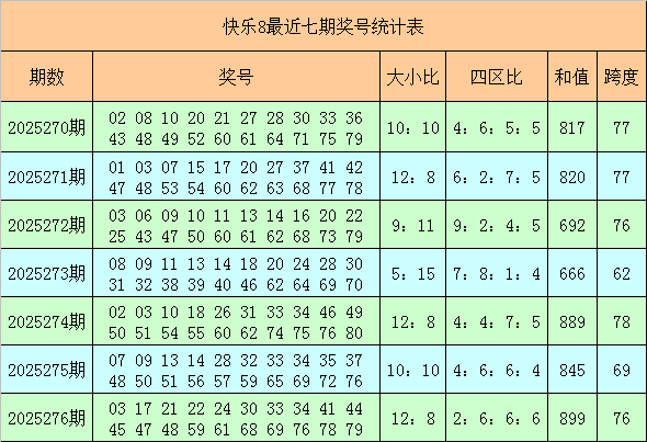 福彩快乐8第2025276期开出奖号:03 17 21 22 24 30 33 34 41 44 45 47 48 59 61 68 69 76 78 79,其中奖号大小比为12:8,四区比为2:6:6:6,和值为899,跨度为76。