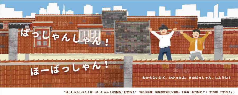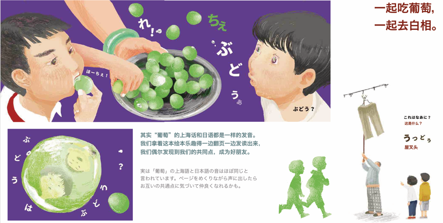 和楼上楼下的上海阿姨爷叔处久了,宇山纺渐渐听得懂一些上海话,发现“葡萄”与日语“ブドウ”同音,“白相”注音“ばいしゃお”,于是她以此创作了绘本《白相相,好白相!》:日本男孩弄堂里一句“葡萄”就能和上海小哥吃到一起。