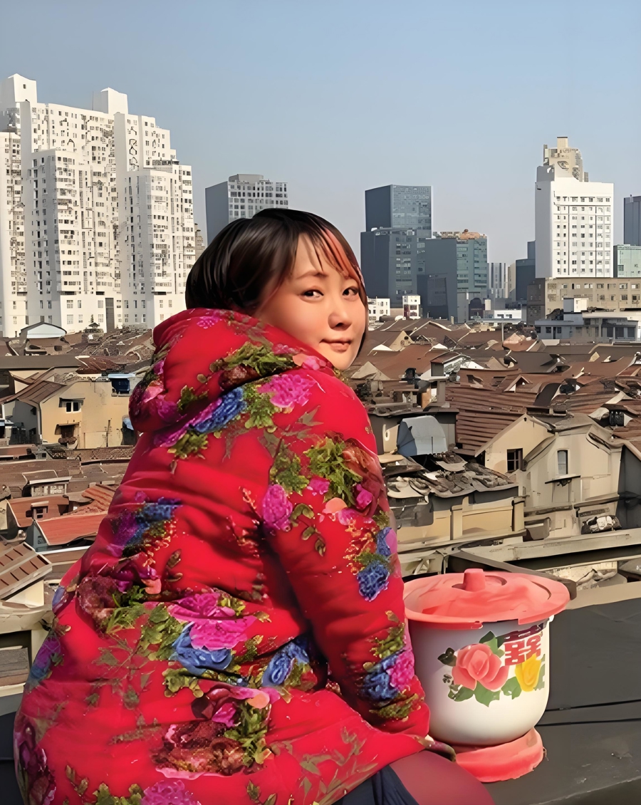 宇山纺穿着上海老式花棉袄与痰盂合影。