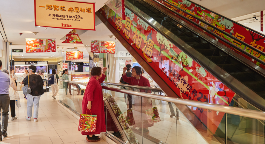 宇山纺画的南京西路27年变迁,布置在伊势丹商场。