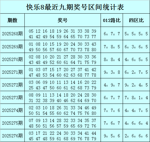 福彩快乐8第2025276期开出奖号:03 17 21 22 24 30 33 34 41 44 45 47 48 59 61 68 69 76 78 79,其中奖号012路比为9:5:6,四区比为2:6:6:6。